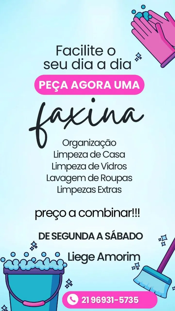 Organização, limpeza de casa, vidros, roupas e serviços extras. De segunda a sábado. Ligue e agende seu horário!