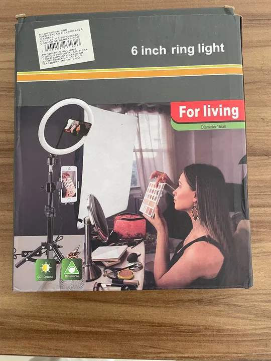 Ring Light 6 polegadas ideal para lives e vídeos, com ajuste de intensidade e temperatura de cor. Iluminação perfeita para fotos e vídeos de alta qualidade. Acompanha tripé para ajuste de altura.
