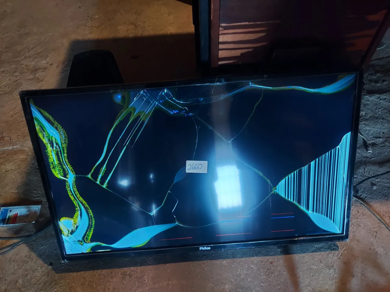 A TV liga normal, mas a tela está trincada/estourada, então estou vendendo para peças: placa-mãe, fonte, carcaça, alto-falante, etc.