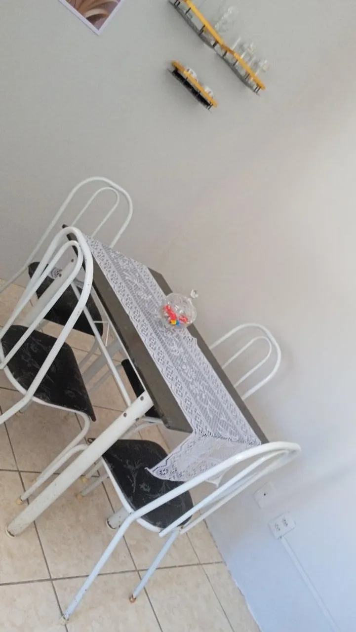 Mesa em ardósia 1.05 centímetros inteira nada de quebrado até as 4 cadeiras só ferrugem de anos e da casa onde tava ser muito umida fora isso tá muito boa pra area esterna da casa na varanda por ser pequena e n ocupar espaço